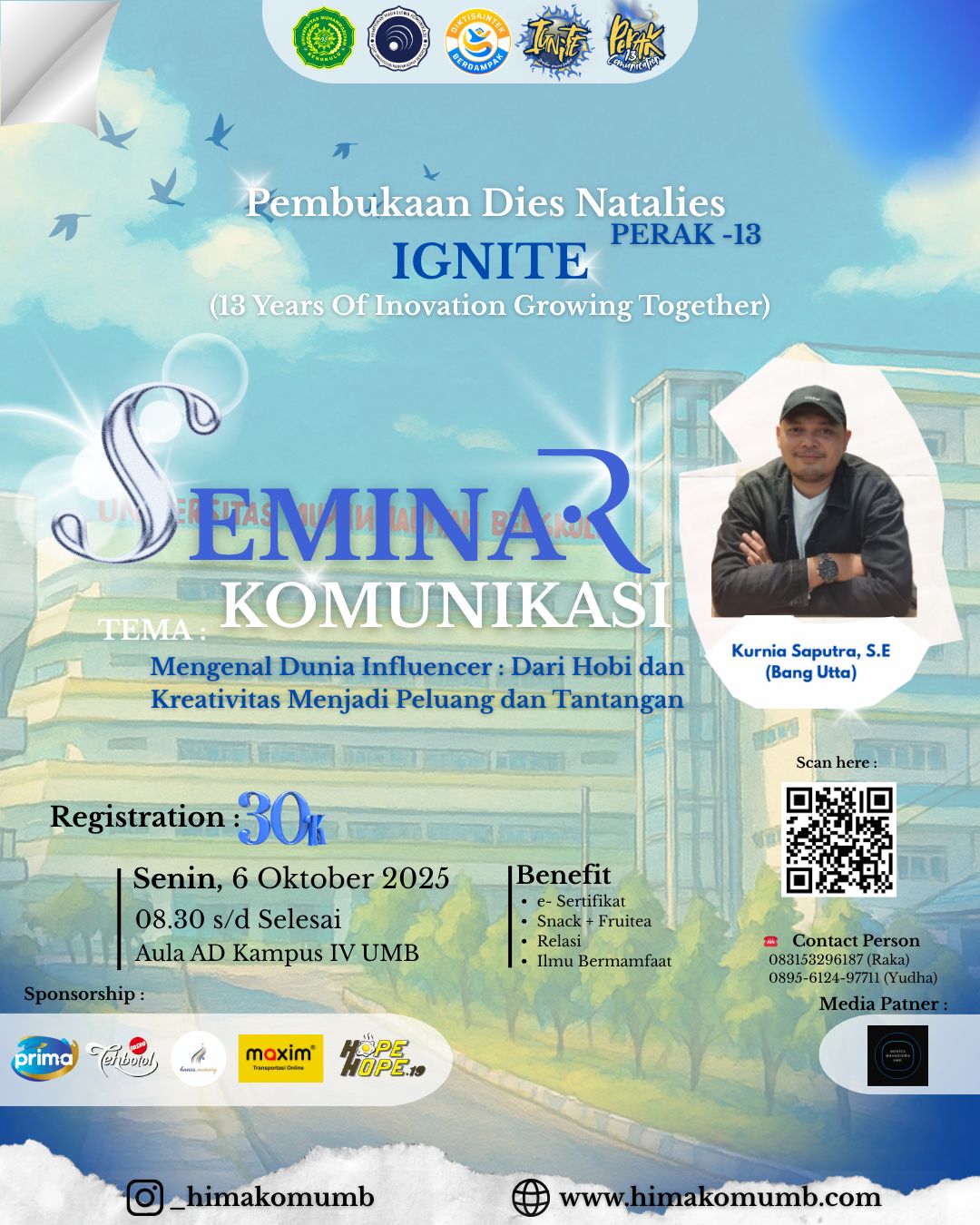 Himpunan Mahasiswa Ilmu Komunikasi (HIMAKOM) Universitas Muhammadiyah Bengkulu (UMB) akan menyelenggarakan Seminar Komunikasi dalam rangkaian acara Dies Natalies PERAK ke-13, yang bertajuk “IGNITE” (13 Years of Innovation Growing Together).