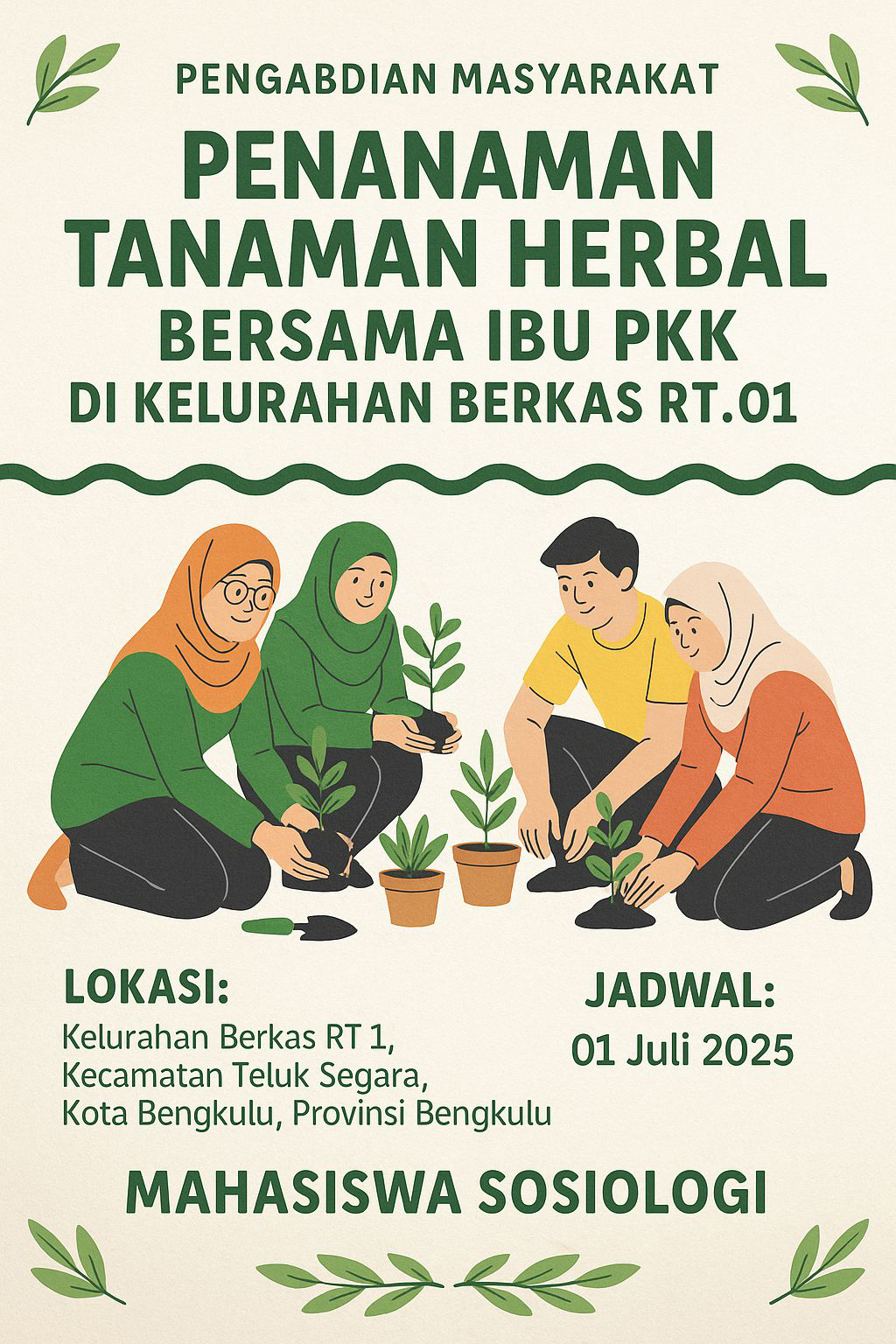 Pengabdian masyarakat yang dilaksanakan oleh Mahasiswa Sosiologi semester 6 dengan mengusung tema “Penanaman tanaman herbal bersama ibu PKK di Kelurahan Berkas RT 01”