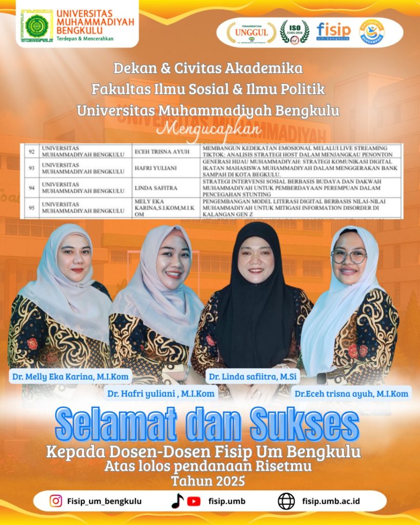 Fakultas Ilmu Sosial dan Ilmu Politik (FISIP) Universitas Muhammadiyah Bengkulu kembali menorehkan prestasi membanggakan melalui lolosnya sejumlah dosen dalam program pendanaan penelitian skala nasional Riset Muhammadiyah (RisetMu) 2025. Berdasarkan pengumuman resmi, empat dosen FISIP berhasil memperoleh pendanaan untuk proposal penelitian yang dinilai inovatif, relevan, dan berdampak sosial luas.